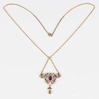 An Edwardian gold, amethyst, peridot and seed pearl pendant necklace of Suffragette interest, the front in a scroll pierced design, mounted with an oval cut amethyst to the centre and a pear shaped peridot to the drop, detailed '15', with an oval link neckchain on a boltring clasp, weight 8.7g, length 47.5cm.
