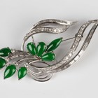 An Asian white gold, dyed green jade and diamond brooch, designed as a foliate spray, mounted with pear and marquise shaped jades, otherwise set with circular and baguette cut diamonds, detailed '18K', weight 10.6g, width 6cm, with a case.