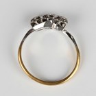 A gold, platinum and diamond ring, mounted with three circular cut diamonds within heart shaped settings, detailed '18ct & Pt', weight 3.1g, ring size approx N1/2, with a case.