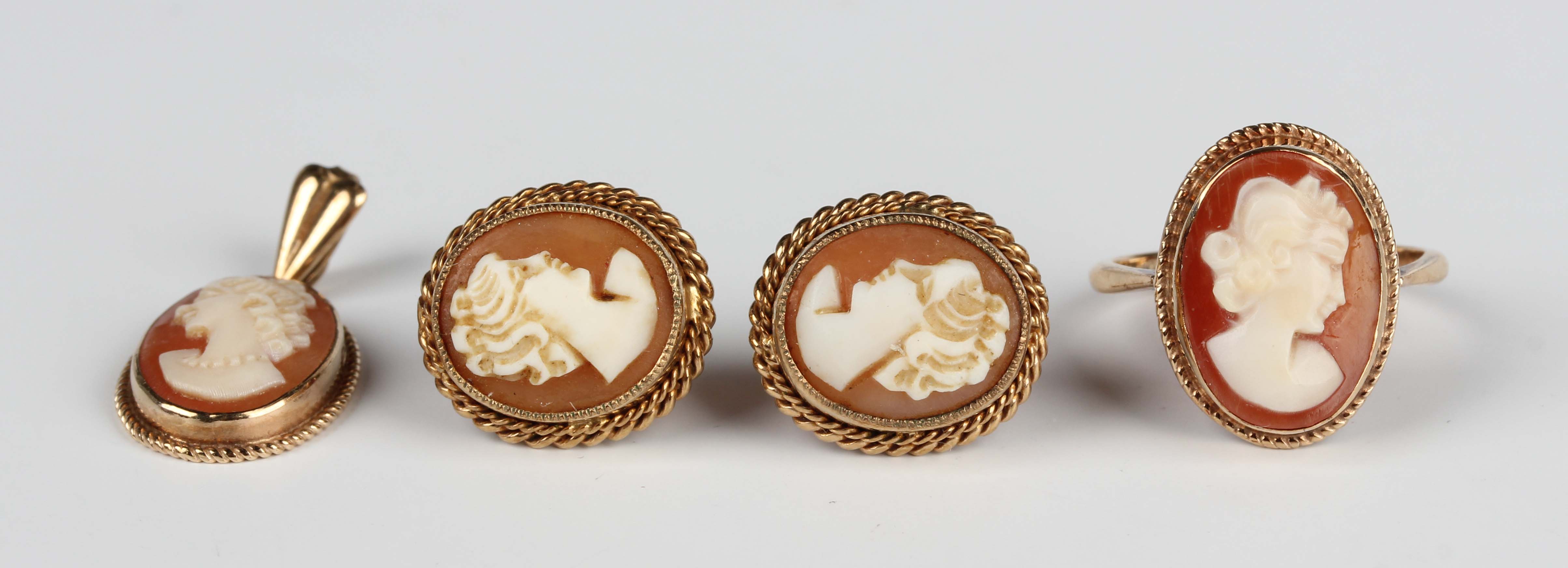 A gold and oval shell cameo ring, carved as a portrait of a lady, detailed '9ct', ring size approx J1/2, a similar 9ct gold mounted oval shell cameo pendant and a pair of 9ct gold mounted oval shell cameo earstuds with post and butterfly fittings, total weight 7.8g.