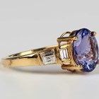 An 18ct gold, tanzanite and diamond ring, claw set with the oval tanzanite between baguette cut shoulders, Birmingham 2011, weight 3.4g, tanzanite weight approx 2.76ct, total diamond weight approx 0.33ct, ring size approx N, with a Lorique certificate card, box and case.
