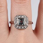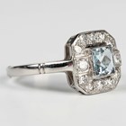 A platinum, aquamarine and diamond cluster ring, collet set with the square cut aquamarine within a surround of circular cut diamonds, detailed 'Plat', weight 4.4g, ring size approx N1/2.