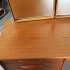 A mid-20th century Austinsuite teak dressing table of retro design, height 121cm, width 169cm, depth 46cm, a matching stool, a matching tall chest of six drawers, height 115cm, width 64cm, depth 43cm, and a G-Plan headboard with fitted bedsides, width 226cm.