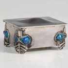 An Edwardian Arts and Crafts silver and enamelled trinket box by Liberty & Co, the domed lid above stylized plant corner supports with blue/green enamelled panels, Birmingham 1907, bearing model number '924' to underside, width 6.3cm.