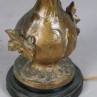 A pair of French Art Nouveau painted spelter three-branch table lamps, the figural bases cast with water nymphs and flowers below frosted glass shades, height 66cm (some restoration).