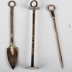 An Edwardian silver pipe stand, modelled to hold three pipes and hung with three tools, Birmingham 1901, height 18cm, together with a nickel cigar cutter, a cross-bar corkscrew and a duck caller.