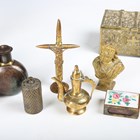 A mixed group of collectors' items, including a Victorian go-to-bed vesta case, detailed 'Prince Albert's Safety Box', height 6.3cm, a 19th century gilt metal bust of Jesus Christ, a counter bell and an Egyptian engraved model of a pyramid.
