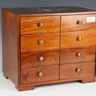 A late 20th century Chinese hardwood table-top chest of four drawers, the top inlaid in mother-of-pearl, height 31cm, width 36cm.