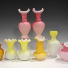 A mixed group of mostly Stourbridge air trap satin glassware, late 19th century, including vases, jugs and bowls, predominantly with a quilted diamond design but also chevrons, stripes and spots, in blue, pink, orange and yellow, height of tallest vase 30cm (minor faults). Provenance: from the collection of John and Poppy Stallebrass.