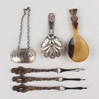 A late Victorian Scottish silver caddy spoon with bright cut and shell handle and scalloped bowl, Edinburgh 1895 by Hamilton & Inches, length 7.5cm, together with a Scottish carved horn caddy spoon, a George III silver 'Bucellas' label, London 1818 by Charles Rawlings, and three sterling lobster picks, weighable silver 57g.