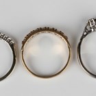 A white gold, platinum, sapphire and diamond three stone ring, mounted with the oval cut sapphire between two circular cut diamonds, detailed '18ct & Plat', weight 3.1g, ring size approx P, a 9ct white gold and diamond half hoop ring, mounted with a row of princess cut diamonds, and a 9ct gold and colourless gem set seven stone ring, total weight 3.5g.