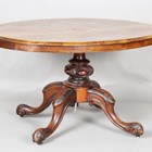 A late Victorian walnut and foliate inlaid oval tip-top breakfast table, on carved cabriole legs, height 73cm, length 129cm, depth 94cm.