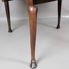 A George III figured mahogany oval drop-flap dining table, fitted with a single drawer and raised on cabriole legs with carved hoof feet, height 73cm, width 151cm, depth 121cm.