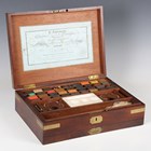 A William IV figured mahogany and brass bound artist's box by R. Ackermann 'Superfine and Permanent Watercolour Manufacturer', the hinged lid with large printed maker's label, the interior with watercolour blocks, alabaster mixing tablet and ceramic palette, width 34cm.