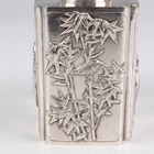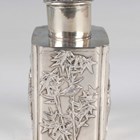 A Chinese export silver tea caddy and cover, circa 1900, of lobed rectangular form, the sides applied in relief with figures, birds and flowers, the cylindrical sleeve cover engraved with a chrysanthemum, maker's mark for Tuck Chang & Co of Shanghai to base, weight 272.3g, height 11.2cm.