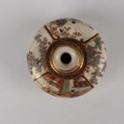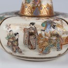 A Japanese Satsuma earthenware bottle vase by Ryozan, Meiji period, the slender tapering neck painted and gilt with bijin and children at play within simulated brocade borders, above a compressed circular body painted and gilt with opposing figural panels, divided by panels of sparrow with wisteria and a fenced chrysanthemum garden, gilt and black Ryozan signature beneath Yasuda trade mark to base, height 14.4cm.