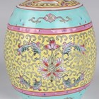 A Chinese famille rose porcelain potpourri jar, mark of Qianlong but 20th century, the ovoid body painted with a scene of figures and dog beside a lakeside pavilion, opposing lines of black text and red seals, blue enamelled seal mark to base, height 13cm (lacking cover), together with a Chinese famille rose vase, painted with a seated maiden, height 16.2cm, and two Chinese famille rose yellow ground porcelain jars and covers, 20th century, of barrel form, heights 15.5cm and 11.4cm. Provenance: the property of a West Sussex private collector.