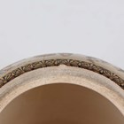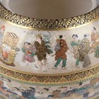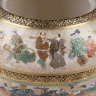 A Japanese Satsuma earthenware jar by Kinkozan, Meiji period, of ovoid form, finely painted and gilt with bands of figures, cranes flying above waves and precious vessels between simulated brocade and floral borders, impressed Kinkozan seal mark to base, height 9cm (hairline crack to rim and lacking cover).