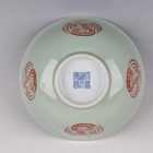 A Chinese iron red decorated celadon glazed porcelain circular bowl, mark of Daoguang but later, of steep-sided circular form with slightly flared rim, the interior painted with an iron red fenghuang roundel, the exterior with four further roundels, underglaze blue pseudo seal mark to base, height 6.7cm, diameter 14.8cm.