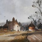 Marcus Ford - 'Village by the Downs', 20th century oil on canvas, signed recto, titled Frost & Reed label verso, 44cm x 81.5cm, within a swept gilt composition frame.
