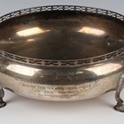 A George V silver circular bowl, inscription engraved, with pierced rim, raised on cast bellflower and festoon shouldered scroll legs terminating in pad feet, Birmingham 1928 by Docker & Burn Ltd, weight 884.2g, diameter 28cm, height 10cm.
