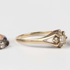 A gold ring, mounted with two circular cut diamonds, detailed '18ct, weight 2.5g, ring size approx Q1/2 (one diamond lacking), three 9ct gold and gem set rings, total weight 5.3g, and a gold and silver and colourless gem set ring, detailed '9ct & Sil', weight 2.7g.