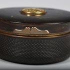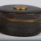 A George III pressed tortoiseshell circular snuff box, the hinged lid inset with a hunt button, diameter 7.5cm.