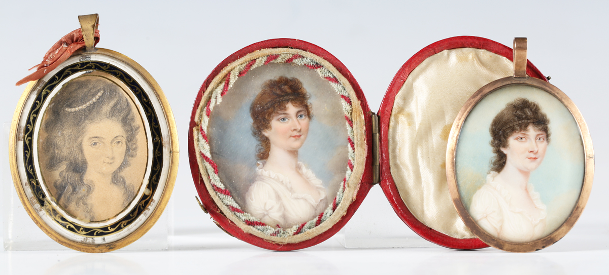 British or Irish School - a late 18th/early 19th century oval half-length portrait miniature of a lady wearing a white dress, watercolour on ivory, 4.5cm x 3.8cm, within a gilt metal frame, together with another near period copy of the same miniature within a red leather case, another pencil miniature of Lady Newport and a glazed photograph of a boy. Provenance: family descent from Lieutenant-General Paul Anderson to the current vendor. Formerly at Grace Dieu, Waterford. Note: a non-transferrable ivory exemption certificate has been granted for the sale of this item. Ref: for related portraits and paintings, see Lots 7,8, 9, 29, 31 and 45 in our sale of Fine Art on 29th November and further portrait miniatures in this sale of Objects of Virtu.