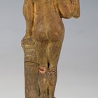 An ancient Roman terracotta full-length figure of a lady with long flowing hair, standing beside a column, height 16cm, mounted on a Sienna marble plinth (faults and repairs).