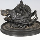 A late 19th century black painted cast spelter novelty inkwell in the form of a boar's head, mounted on an oval wooden plinth, length 22cm.