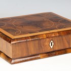 A William and Mary laburnum oyster veneered box with sycamore crossbanding and bone inlaid key escutcheon, width 26.5cm (later re-lined and some restoration).