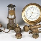 A mid-20th century Protector Lamp & Lighting Type 6 miner's lamp, a pair of brass railway carriage style lamps and a brass cased barometer.