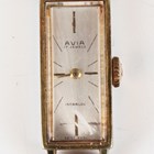 An Avia gilt metal fronted and steel backed lady's wristwatch, the signed rectangular silvered dial with baton hour markers, case width 1.1cm, fitted to a 9ct gold bracelet, total weight 13.9g.