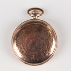 A gold keyless wind hunting cased gentleman's pocket watch with gilt three quarter plate movement, the enamelled dial with black Roman hour numerals, inner red twenty four hour Arabic numerals and subsidiary seconds, gilt metal inner case, the case front and back with engraved foliate decoration, total weight 70.8g, case diameter 4.7cm.