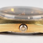 An Omega Electronic F 300 Hz chronometer gilt metal fronted and steel backed gentleman's wristwatch, circa 1972, the signed 12.50 caliber movement numbered '34804195', the signed gilt dial with baton hour markers and date aperture, the signed case back interior numbered '198.030', case width 3.8cm, on a leather strap.