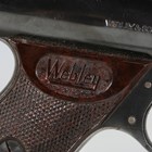 A Webley Premier .22 air pistol with composite plastic grips, together with a Webley metal target holder and a group of paper targets and pellets.