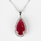 A white gold, ruby and diamond cluster pendant, claw set with the large pear shaped ruby within a surround of circular cut diamonds, unmarked, weight 4.1g, ruby weight approx 4.80ct, total diamond weight approx 0.59ct, with a silver neckchain, detailed ‘925’, on a boltring clasp, weight 1.3g, length 46cm, with a case.