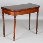 A George III mahogany fold-over card table, the wide crossbanded top above a banded frieze, on turned legs, height 73cm, width 90cm, depth 45cm.