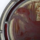 A 20th century Art Deco style stained and leaded glass panel depicting a tennis player, diameter 51cm, another smaller panel depicting an otter with a fish, diameter 31cm, and another depicting a fireside figure with a spinning wheel, signed 'E. Pintelon 1927', height 36cm, width 39cm.