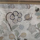 A late 17th century stumpwork panel, finely worked in coloured silks, chenille and foil embellishments with a central couple flanking a monkey, standing within a garden surrounded by a leopard, other animals, a country manor and a fountain, all on a cream silk ground, 34cm x 43cm, within a gilt frame.
