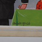 Donald McGill – ‘And now, dear friends, I want a committee of ladies to sit on the supply of eggs!’, 20th century watercolour with gouache on card, signed recto, titled verso, 14.5cm x 27.5cm.