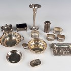 An Edwardian silver tasse du vin (wine taster), Chester 1905 by George Nathan & Ridley Hayes, length 11.5cm, and a small group of other silver, including napkin rings, total weight 286.9g, a Dutch .830 silver two-handled bonbon dish, length 13.8cm, and a Dutch silver rectangular ashtray, length 11.5cm, total weight 149.9g, together with a .925 sterling novelty pepper caster in the form of a Japanese okobo (sandal), length 4.5cm, a specimen vase, unmarked, and a plated dish.