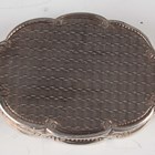 A Victorian silver lobed oval engine turned vinaigrette, the hinged lid revealing a hinged gilt grille, pierced and engraved with scrolls, Birmingham 1864 by John Tongue, weight 16.4g, length 4cm.