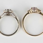 A 9ct white gold and diamond circular cluster ring, ring size approx J, and a 9ct gold, pink and colourless gem set ring, Birmingham 2014, ring size approx Q, total weight 3.8g.
