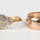 A gold and diamond cluster ring, mounted with five cushion cut diamonds between rose cut diamond shoulders, unmarked, weight 2g, ring size approx S, and a 9ct gold and colourless gem set solitaire ring, Birmingham 1909, weight 1.9g, ring size approx H, with two cases.