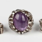A group of mostly silver and gem set jewellery, comprising ten rings, a smoky quartz brooch, three pendants with neckchains, an ingot pendant, a neckchain and a French fifty francs coin 1977.