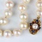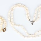 A single row necklace of cultured pearls on a gold, sapphire and cultured pearl clasp, detailed ‘9ct’, length 38.5cm, and a two row necklace of freshwater cultured pearls on a T-bar clasp.
