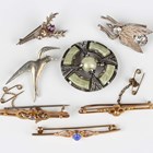 A gold bar brooch with a pierced quatrefoil motif to the centre, indistinct mark, weight 2.1g, a 9ct gold and blue stained agate bar brooch, a gold, seed pearl and pale mauve gem set bar brooch, detailed ‘9ct’, total weight 5g, and four further brooches.
