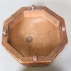 A Victorian walnut footstool with a beadwork top and gilt brass claw feet, diameter 28cm, together with another similar footstool and a black lacquered three-tier cakestand.