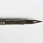 A late 19th century Tunbridge ware straight rule, of octagonal form, one end with hobnail seal terminal, the other screw-off end holding an internal pencil, length 25cm, together with a specimen wood veneered ruler and two Tunbridge ware dip pens.